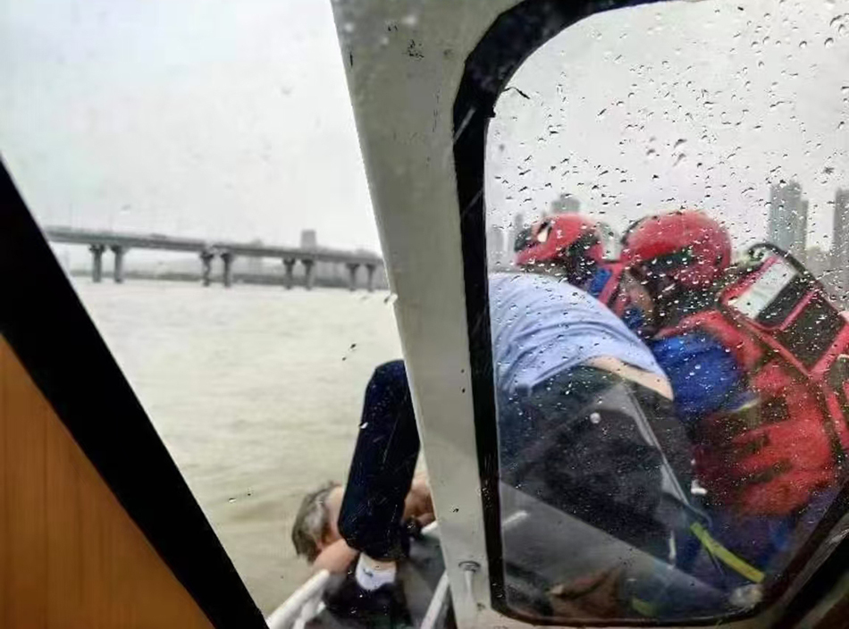 刚被救起的落水男子瘫在警船的船头,身体因为寒冷而抖动着,面对水警的询问和安抚,他声音微小。好在他落水时间不长,身体并无大碍。两位水警放下心来,收好东西,站在他旁边守着。