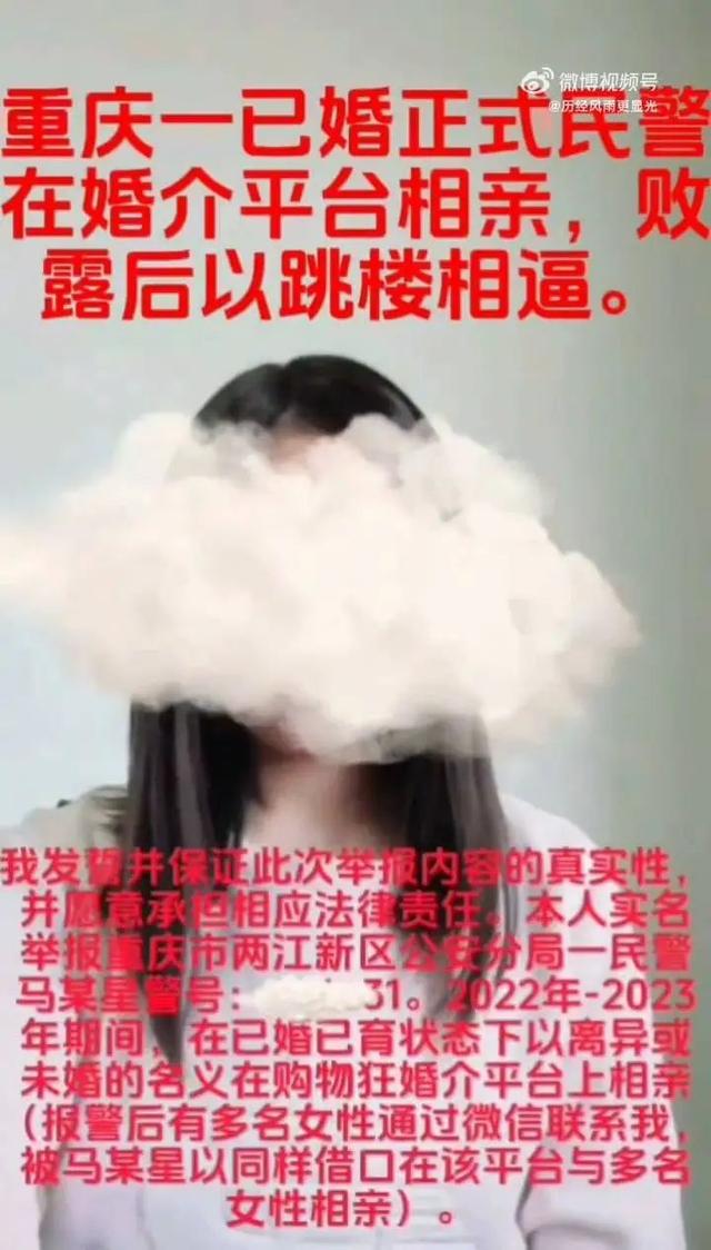 “本人实名举报重庆市两江新区公安分局一民警马某星,2022年至2023年期间,在已婚已育状态下,以离异或未婚的名义在购物狂婚介平台上相亲……”一位女性网友在社交平台上如是发布视频。视频中,该网友称自己与自称单身的马某星,在2022年8月通过重庆购物狂相亲平台相识,其后一年,两人通过断断续续地聊天了解后“发展成为男女朋友关系”。