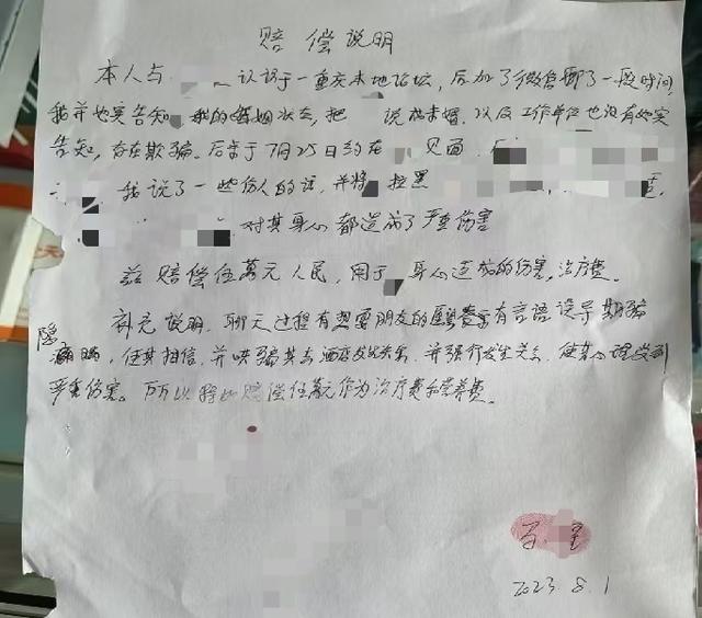 “当时在一个茶楼里,他要跳楼,我很害怕,万一他真的跳楼死了我这辈子就完了。”李莉说,在马某星的软磨硬泡下,她同意和解,马某星写下了“赔偿说明书”。