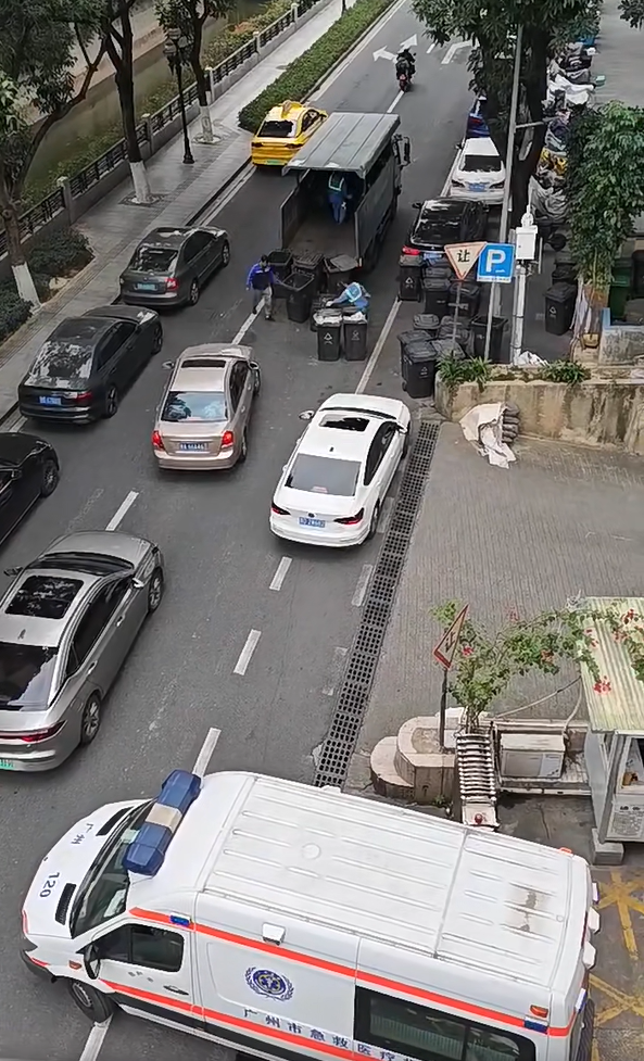 网友发布的视频显示,当时120救护车正在行驶途中,被一辆运送垃圾桶的环卫车堵住,救护车前方还有两辆私家车,不足三股车道的路面,两边停放了不少车辆,这也直接导致路面只剩下中间车道可以正常行驶。看到救护车后,环卫车上的工作人员明显加快了动作,但并没有直接让行。