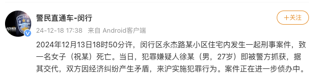 @警民直通车-闵行 12月18日消息,12月13日18时50分许,闵行区永杰路某小区住宅内发生一起刑事案件,致一名女子(祝某)死亡。当日,犯罪嫌疑人徐某(男,27岁)即被警方抓获,据其交代,双方因经济纠纷产生矛盾,来沪实施犯罪行为。案件正在进一步侦办中。