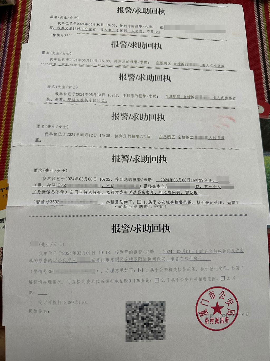 杨蓓及家人被骚扰报警回执 受访者提供