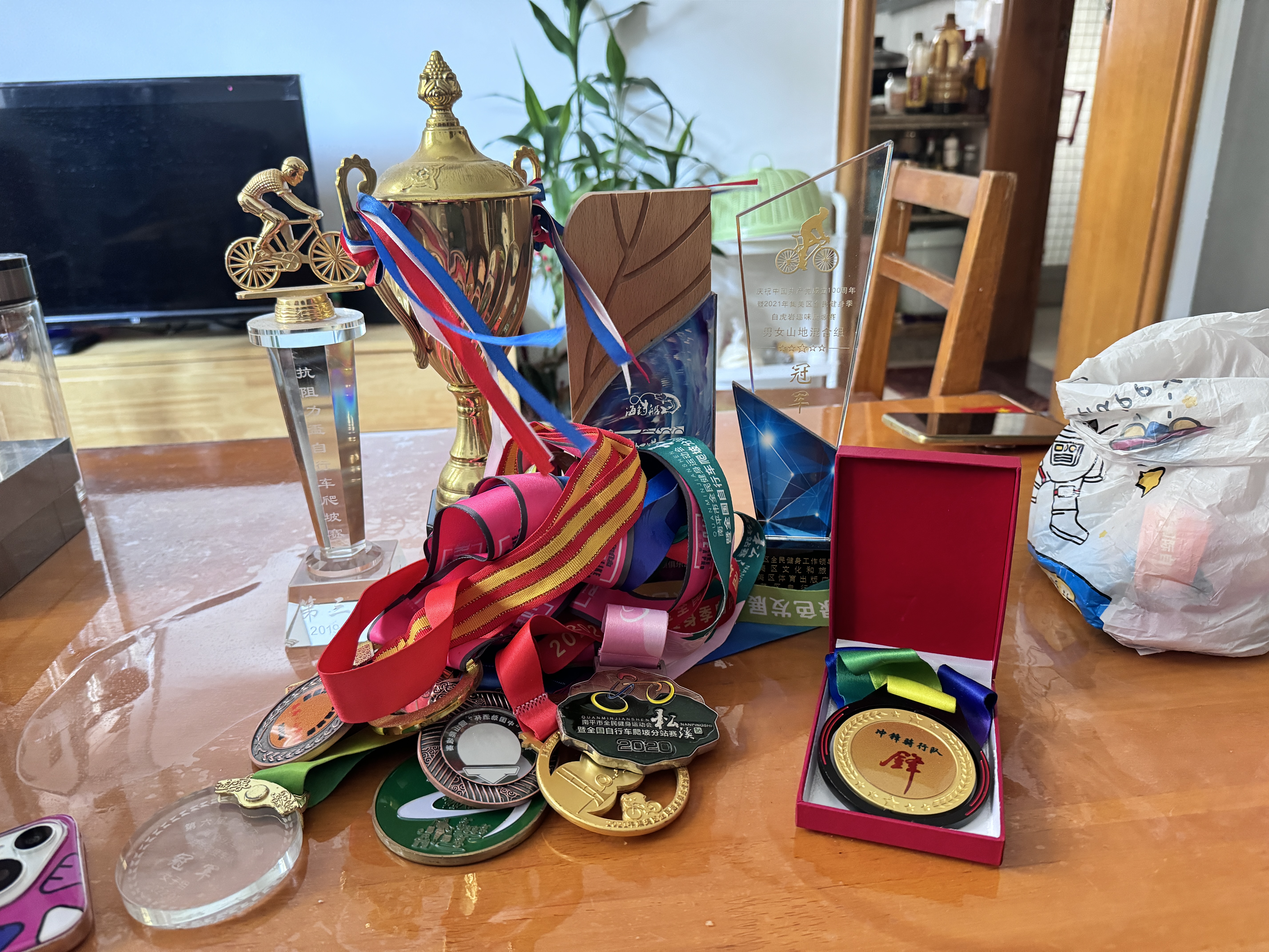 她翻出女儿骑行获奖的各类奖杯和奖牌。黄桂花说,女儿一有空就到处去骑行,去过省内外各地参加比赛,最后一次参赛是5月28日去福建南靖站。