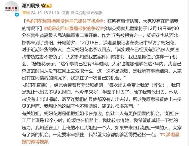 另据潇湘晨报,杨妞花称直播带货是自己抓住了机会。