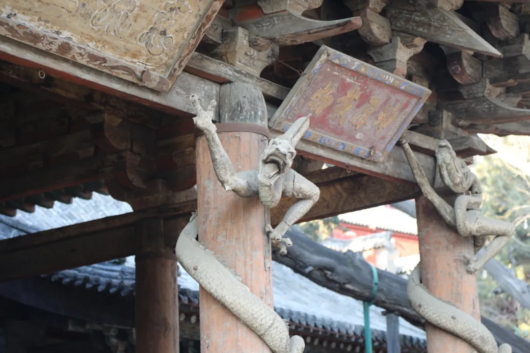 圣母殿前的木雕盘龙,成为游客新宠。在惊叹古人巧夺天工的同时,很多人被北向第二条龙成功“萌化”,只见它身子前倾,右爪伸出,仿佛“比耶”。新的流量密码get,冰箱贴、小挂件统统安排,“比耶龙”成为新晋网红。