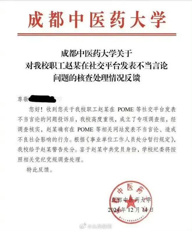 不久后,成都中医药大学也做出了回应,表示已经处以赵某警告处分,并鉴于其中共党员的身份,学校纪委将按照党纪党规调查处理。