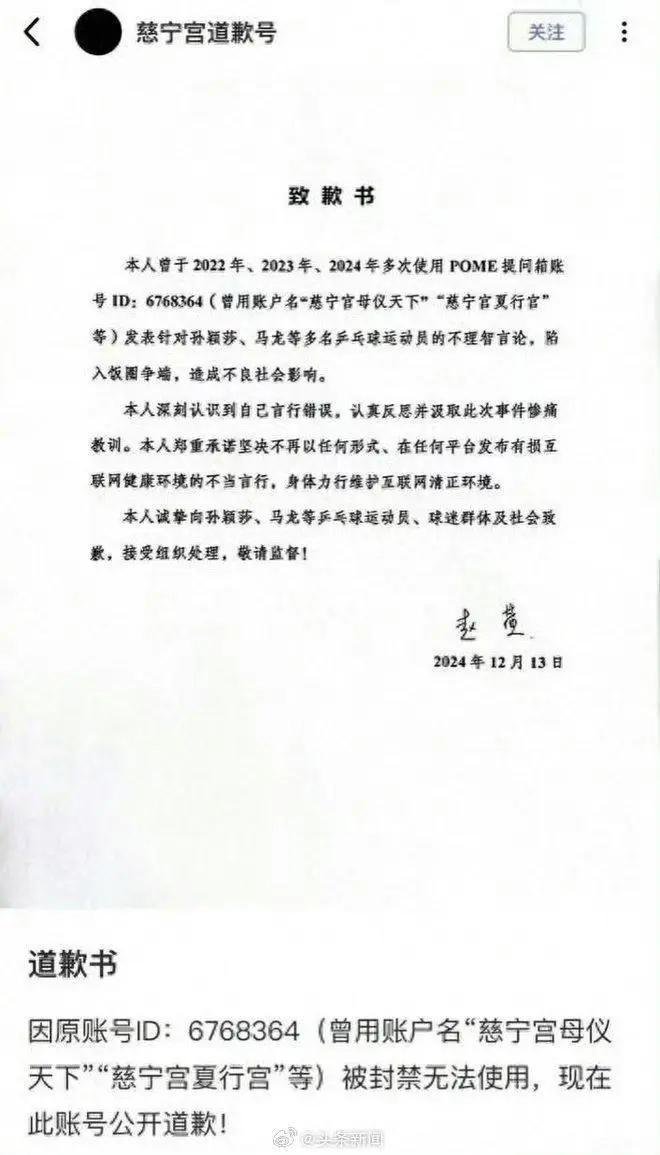 本人曾于2022年、2023年、2024年多次使用POME提问箱账号ID:6768364(曾用账户名“慈宁官母仪天下”“慈宁官夏行官”等)发表针对孙颖莎、马龙等多名乒乓球运动员的不理智言论,陷入饭圈争端,造成不良社会影响。