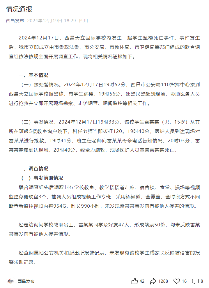 “西昌发布”微信公众号消息,2024年12月17日,西昌天立国际学校内发生一起学生坠楼死亡事件。事件发生后,西昌市立即成立由市委政法委、市公安局、市教体局、市卫健局等部门组成的联合调查组依法依规全面开展调查工作,现将相关情况通报如下。