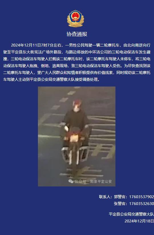 2024年12月11日7时7分左右,一男性公民驾驶一辆二轮摩托车,由北向南逆向行驶至平定县东大街宪法广场外路段,与路边停放的中环洁公司的三轮电动保洁车发生碰撞,三轮电动保洁车驾驶人拦截该二轮摩托车时,该二轮摩托车驾驶人未停车,将三轮电动保洁车驾驶人拖拽、倒地,逃离现场,致三轮电动保洁车驾驶人受伤。为尽快查找到该二轮摩托车驾驶人,望广大人民群众和知情者积极提供有价值线索,同时规劝该二轮摩托车驾驶人主动到平定县公安局交通警察大队接受调查处理。