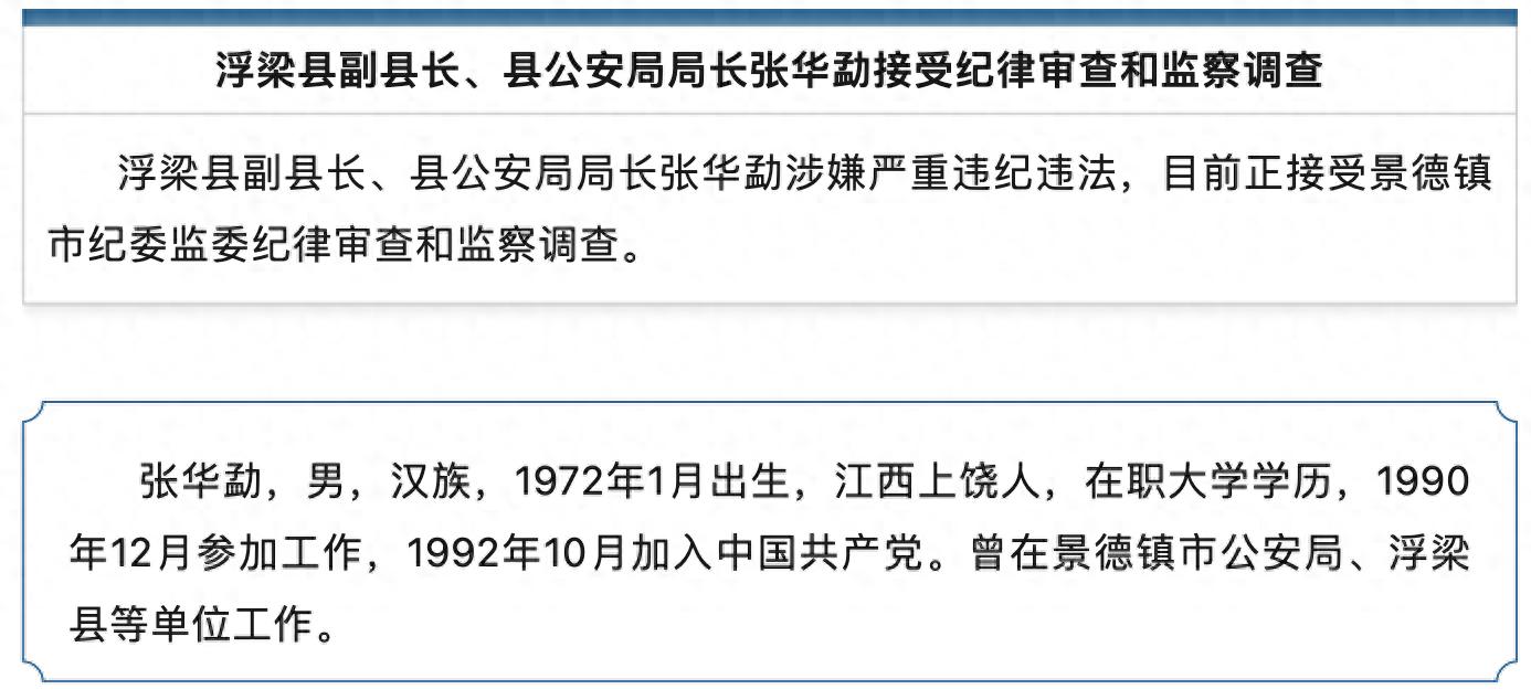 浮梁县副县长、县公安局局长张华勐涉嫌严重违纪违法,目前正接受景德镇市纪委监委纪律审查和监察调查。