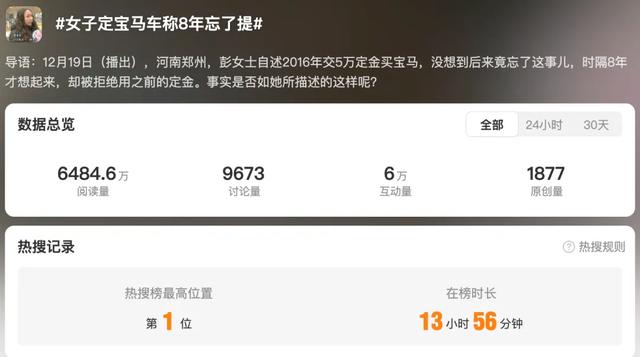 彭女士自述她于2016年交了5万定金买宝马,最初4S店没有现车,一星期后,因为投资其它生意,她的资金链断了,导致没能提成车。当时销售承诺可以随时来提车,但没想到后来自己竟也忘了这事儿。