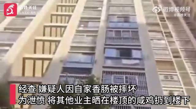 经查,嫌疑人周某因自家香肠被摔坏生气,为了泄愤,遂将其他业主晒在楼顶的咸鸡扔到楼下。