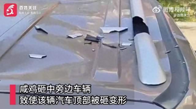 涉事小区保安告知民警自己在巡逻中,突然有两只咸鸡掉下来,抬头再看的时候,发现楼顶有人又扔了两只咸鸡下来,咸鸡砸中旁边车辆,致使该辆汽车顶部被砸变形。