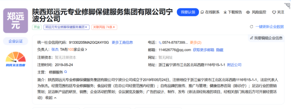 记者搜索到,宁波地区的注册公司名为“陕西郑远元专业修脚保健服务集团有限公司宁波分公司”,该公司成立于2019年5月24日,注册地位于江北区北环西路1116号15-1-1,法定代表人为张杰。