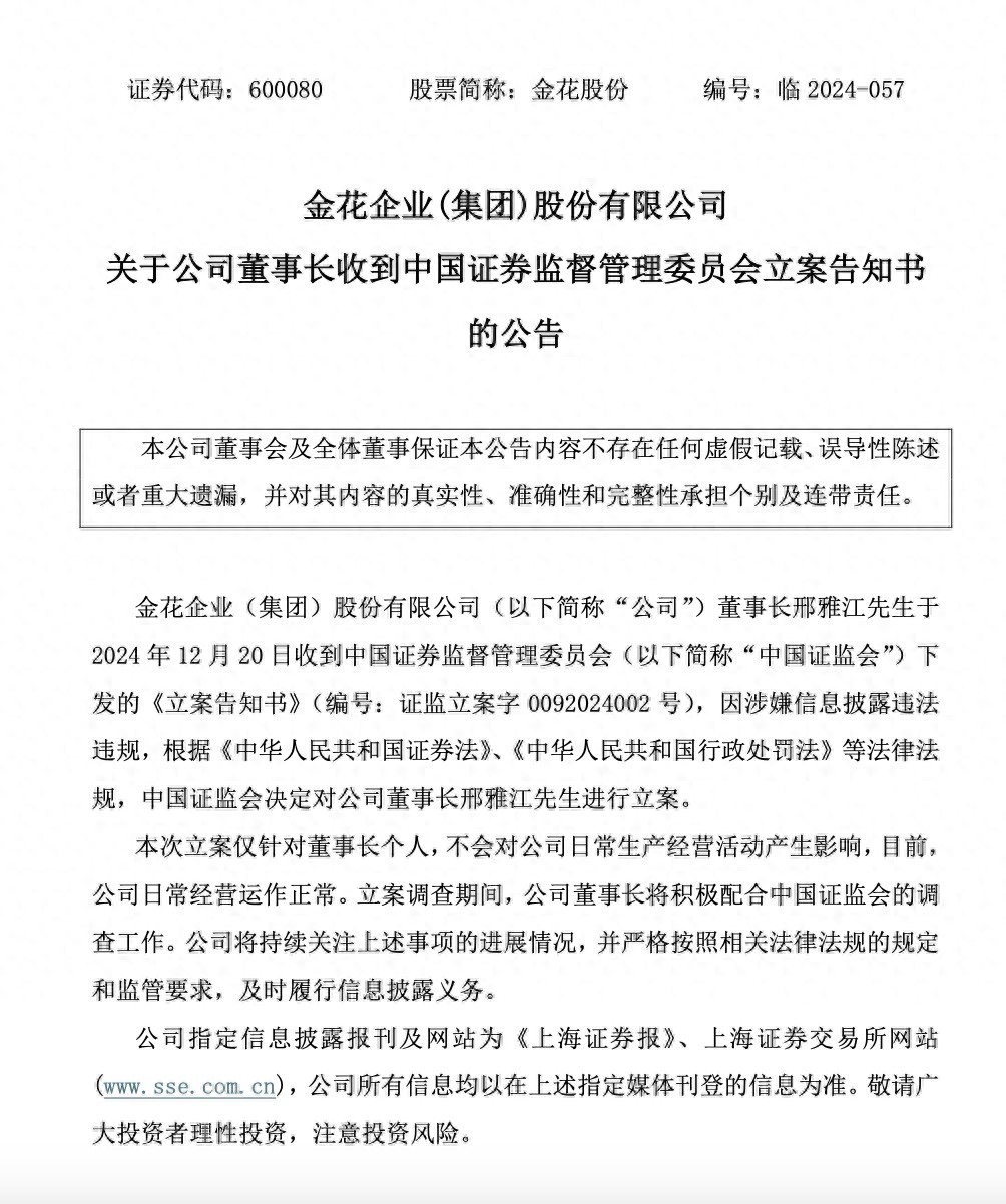 12月21日,金花企业(集团)股份有限公司发布公告称,公司董事长邢雅江被中国证监会立案。