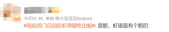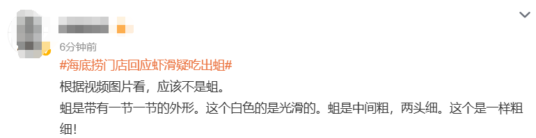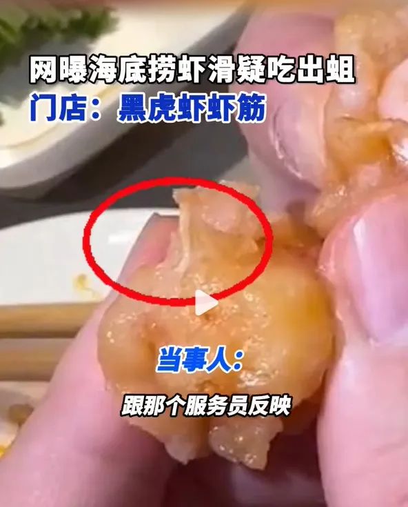 海底捞方面称,顾客所食黑虎虾滑产品原料为斑节虾,虾背部以及腹部有白色虾筋组织,虾筋组织经搅碎、涮煮后会成为长短不一的白色条状。 此外,虾滑制作过程全程冷冻冷藏,也没有滋生虫子的条件。 目前,门店工作人员已陪同顾客将此事上报市场监管部门,由市场监管部门进行专 业权威的调查。
