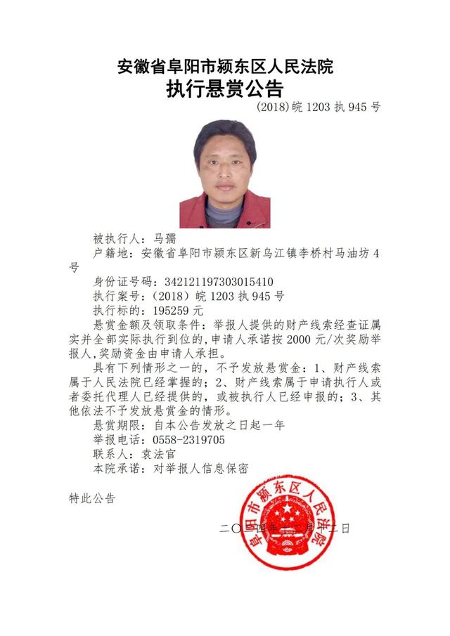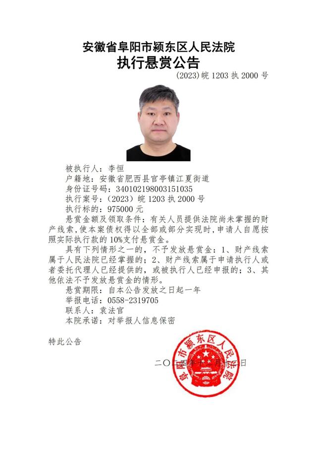 大皖新闻讯近日,阜阳市颍东区人民法院发布2个悬赏执行公告,重金悬赏征集2名失信被执行人有效财产线索。向颍东区人民法院提供有效财产线索,经查证属实,并实际执行到位的,可以获得不同的现金奖励。