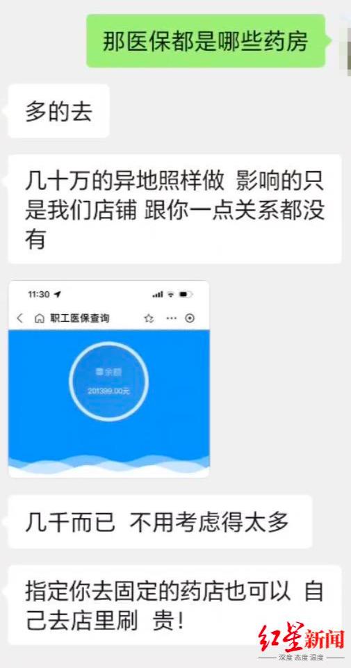 为进一步打消记者顾虑,对方自称与许多药店合作,“几十万的异地照样做,影响的只是我们店铺”,还向记者发来一张201399元的医保卡个人账户余额截图用以佐证,对方称记者卡上的额度小,“几千而已,不用考虑太多”。