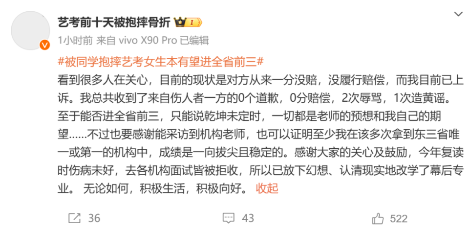 12月21日, 当事人@艺考前十天被抱摔骨折 微博发文称,回应看到很多人在关心,目前的现状是对方从来一分没赔,没履行赔偿,而我目前已上诉。我总共收到了来自伤人者一方的0个道歉,0分赔偿,2次辱骂,1次造黄谣。至于能否进全省前三,只能说乾坤未定时,一切都是老师的预想和我自己的期望……不过也要感谢能采访到机构老师,也可以证明至少我在该多次拿到东三省唯一或第一的机构中,成绩是一向拔尖且稳定的。感谢大家的关心及鼓励,今年复读时伤病未好,去各机构面试皆被拒收,所以已放下幻想、认清现实地改学了幕后专业。无论如何,积极生活,积极向好。