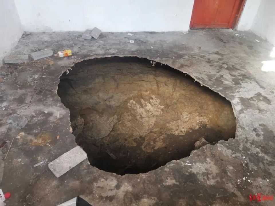 很快,胡玉珍家出现“裂缝”的消息就在村里传开了。陈国武带着一行人来到胡玉珍家,他们看到,此时的厨房,已冒出了一个大洞。这个洞,直径约2米,深约3米,不偏不倚,正处于厨房中部位置,看到的人均十分震惊。