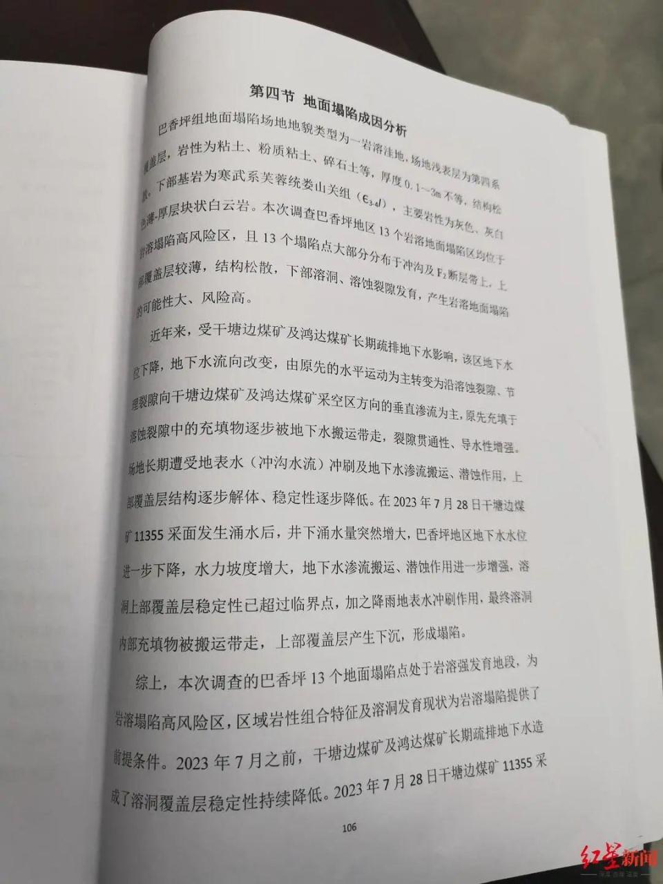 贵州省有色金属和核工业地质勘查局是巴香坪的“地质灾害协作单位”,12月16日,该单位参与调研本次地陷事故的高级工程师熊远鹏告诉红星新闻,他们前期对巴香坪组的地陷灾害作了成因分析。此外,巴香坪组又选出村民代表,委托福泉市自然资源局,选中贵州省地质矿产勘查开发局117地质大队,于今年7月作出《福泉市陆坪镇香坪村巴香坪组地面塌陷地质灾害及井泉干枯成因分析论证报告》,两单位所作的事故原因分析基本一致。
