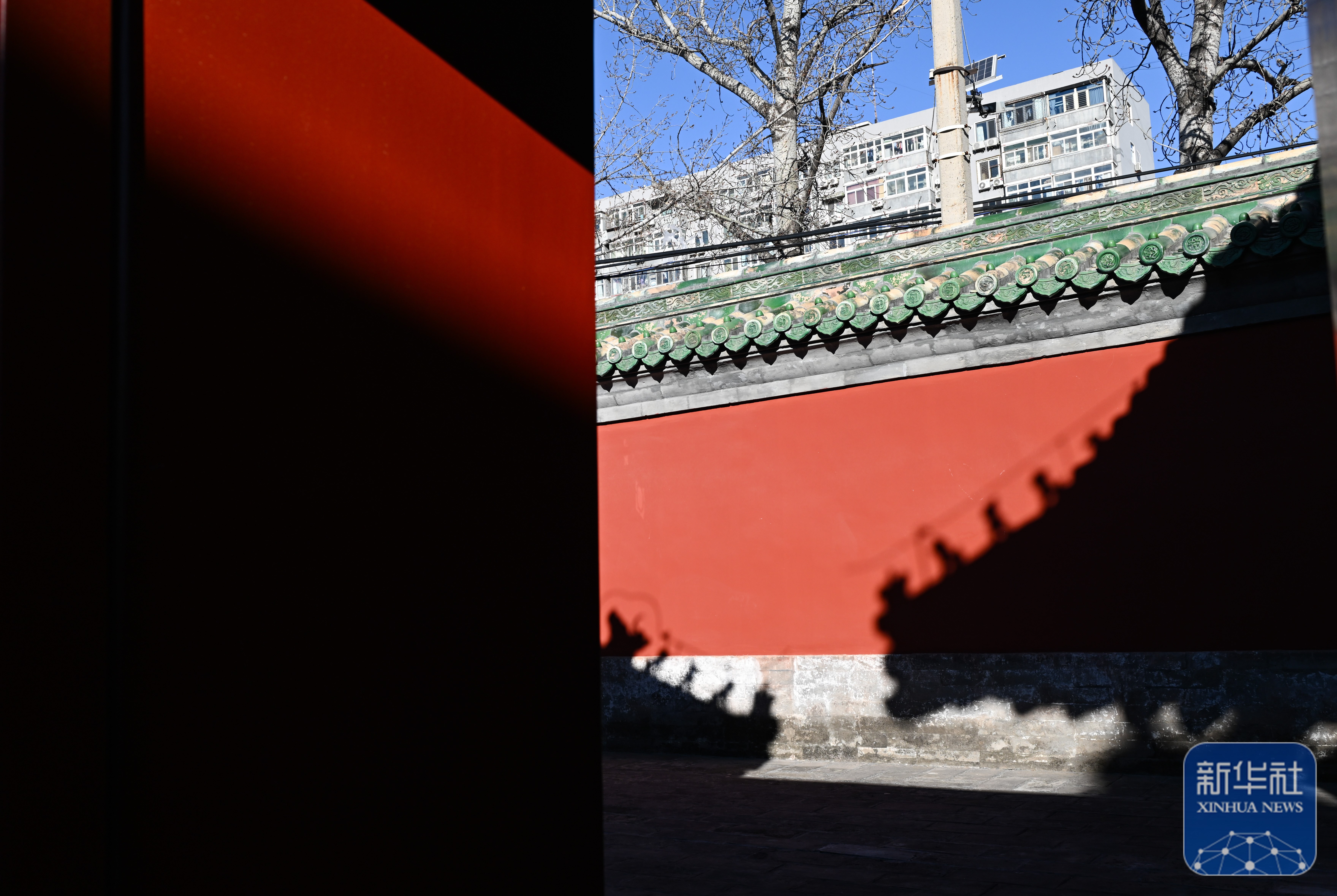 12月21日冬至日,阳光在红墙上照射出庆成宫屋顶和脊兽的影子。