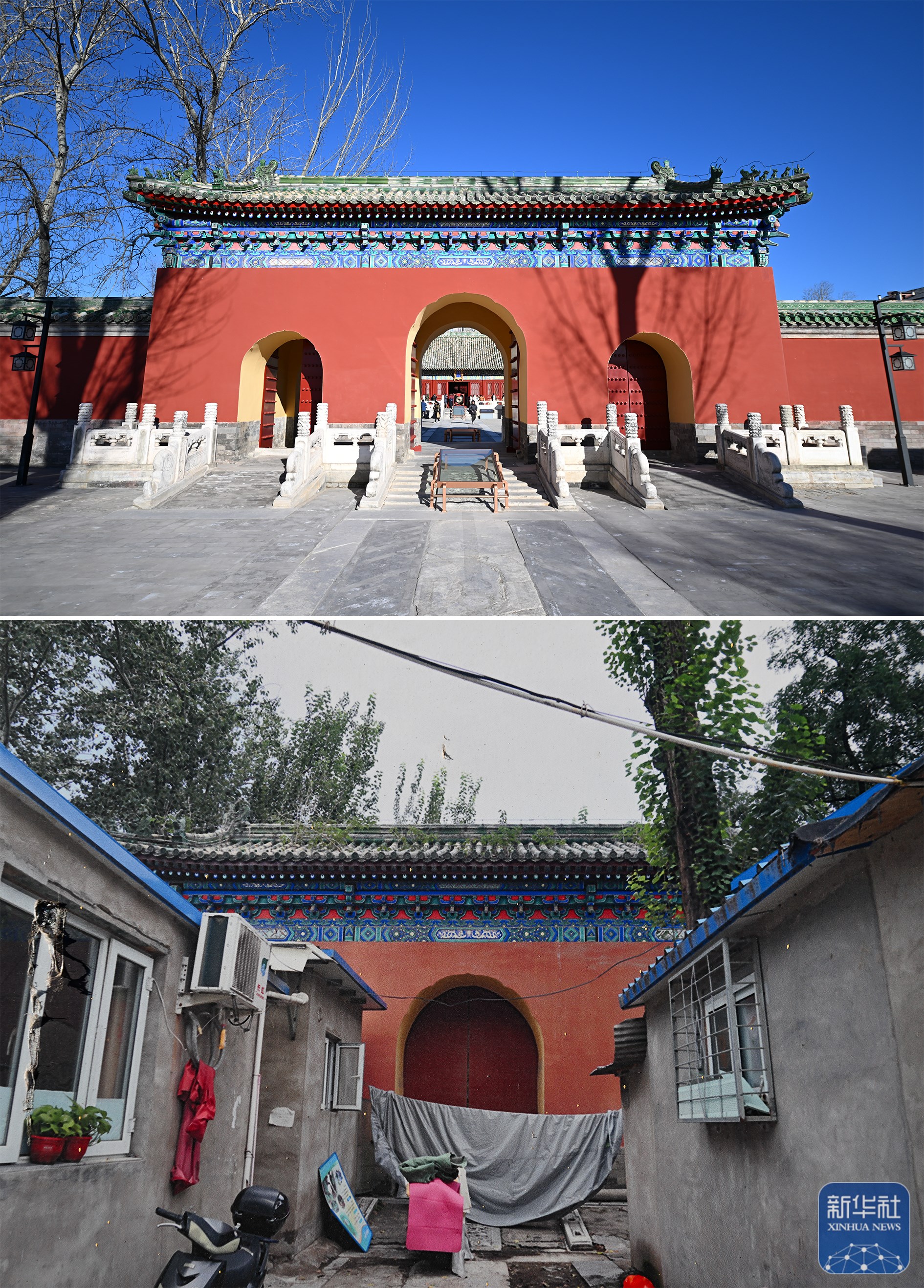 拼版照片:上图为腾退修缮后的庆成宫正殿西侧区域;下图为翻拍的庆成宫正殿西侧区域腾退修缮前的资料照片(12月21日摄)。