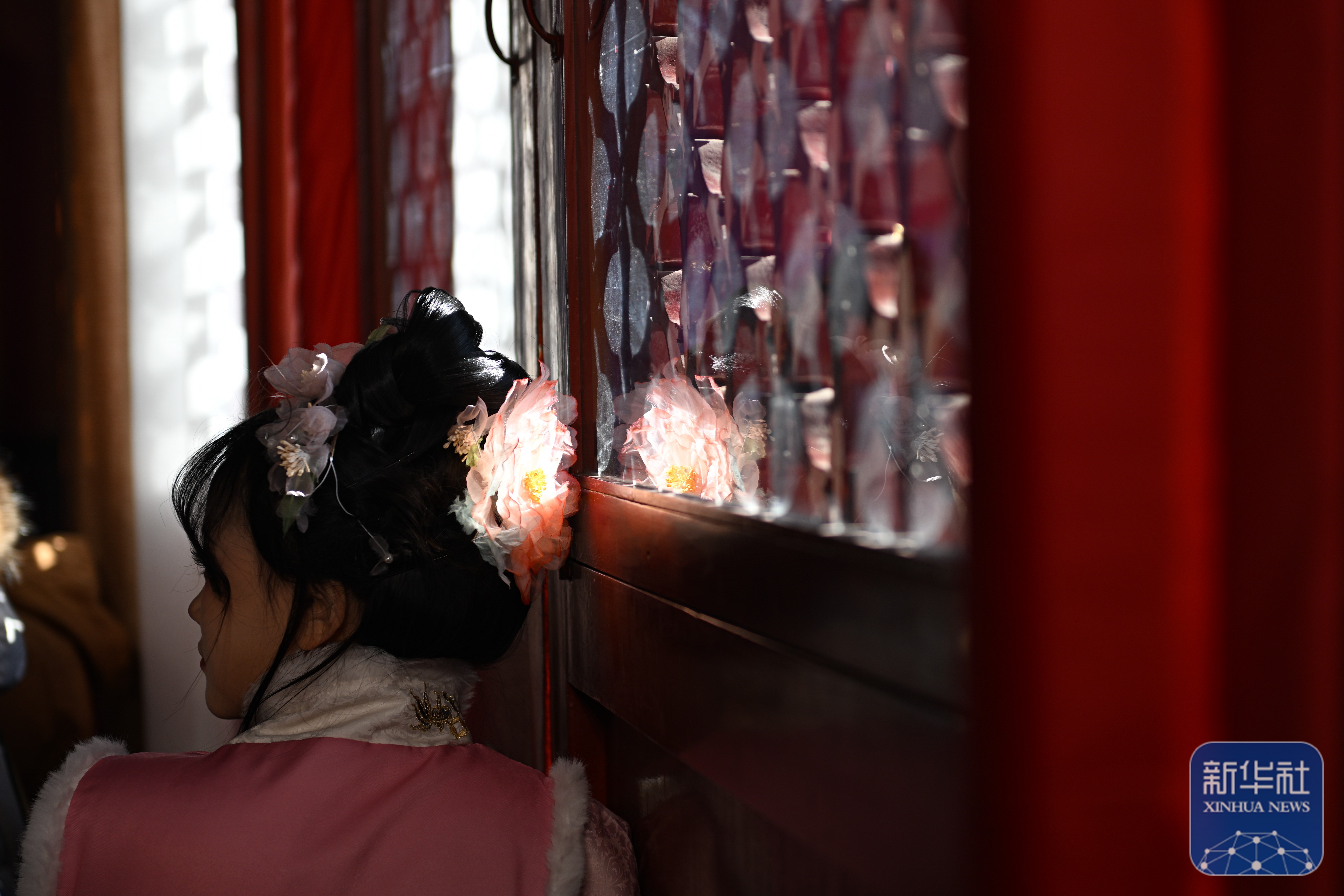 12月21日冬至日,阳光穿过庆成宫正殿的窗花,照亮一名女士的头花。