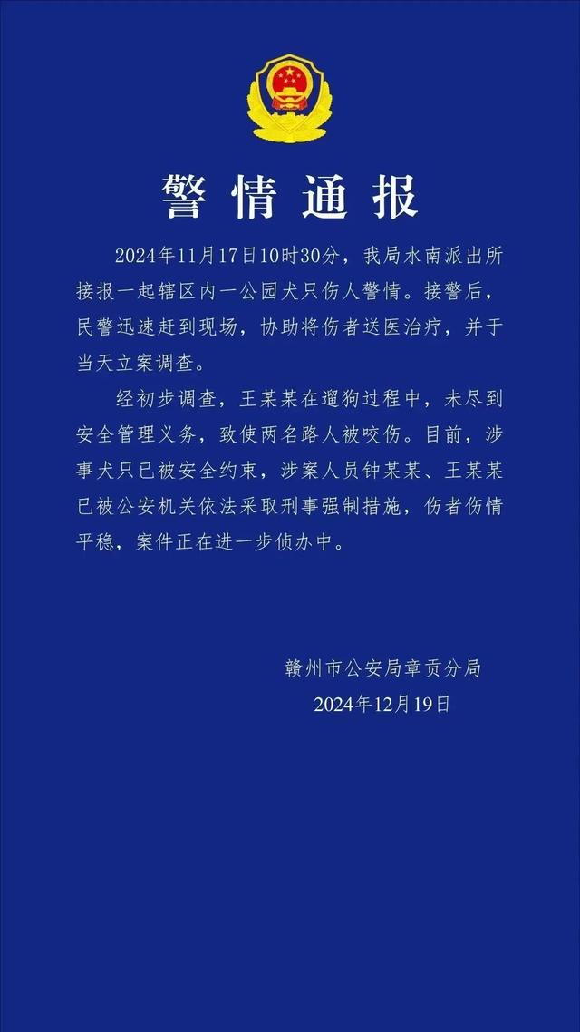 近日,江西赣州一公园内四条大型犬撕咬母女俩一事引发关注。12月19日,赣州市公安局章贡分局对此发布警情通报称,经初步调查,王某某在遛狗过程中,未尽到安全管理义务,致使两名路人被咬伤。目前,涉事犬只已被安全约束,涉案人员钟某某、王某某已被公安机关依法采取刑事强制措施,伤者伤情平稳,案件正在进一步侦办中。