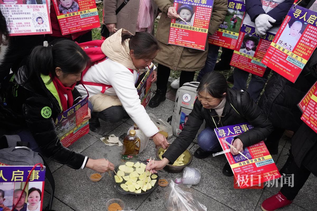 天气寒冷,寻亲家长在法院门口支起自热锅炸土豆片