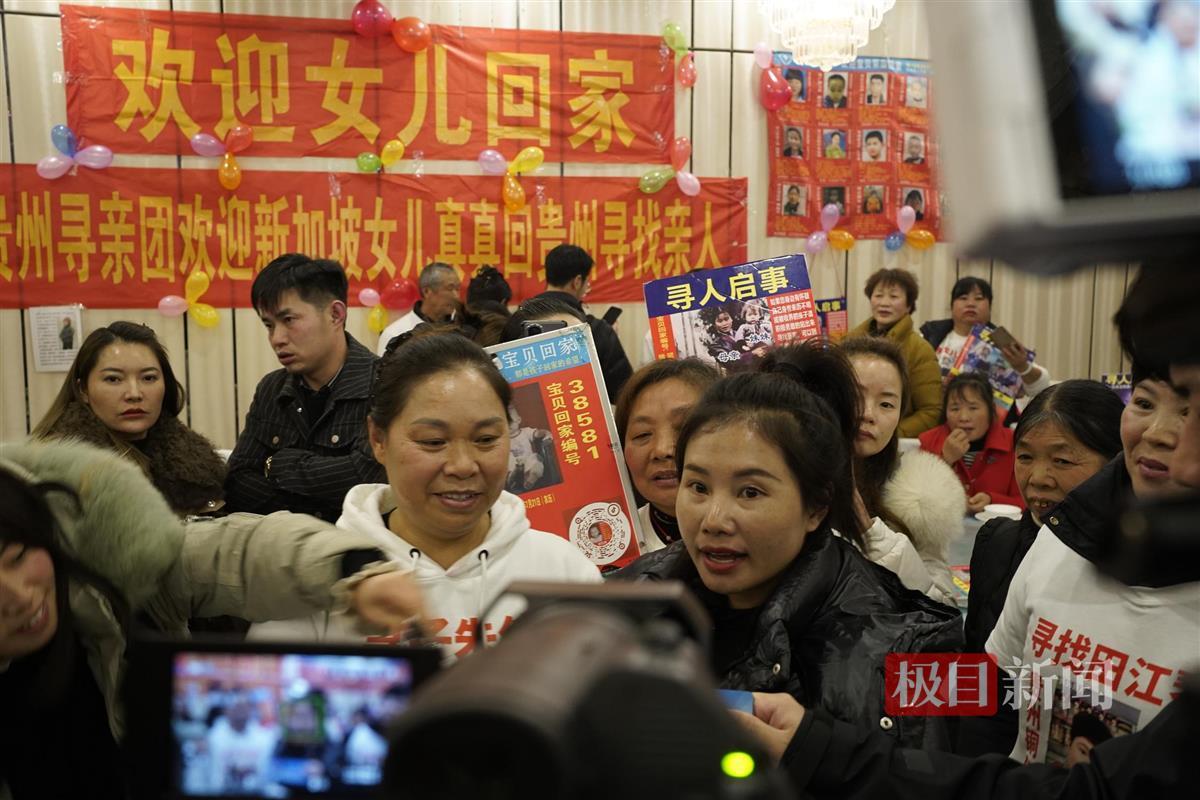 墙上横幅写着“欢迎女儿回家”,寻亲家长们围着杨妞花