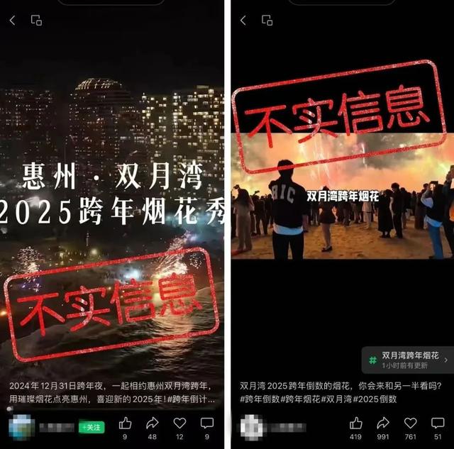 惠东县文化广电旅游体育局发布消息称,经相关部门核实,目前惠东双月湾没有举办2025年跨年烟花秀活动的安排,网传“惠州双月湾2025跨年烟花秀”或称“惠州双月湾跨年海岸线均可燃放烟花”“2025年惠州双月湾跨年烟火(花)秀(表演)”等相关信息均系不实信息。惠东县文化广电旅游体育局提醒广大游客不信谣、不传谣,一切以官方发布信息为准。
