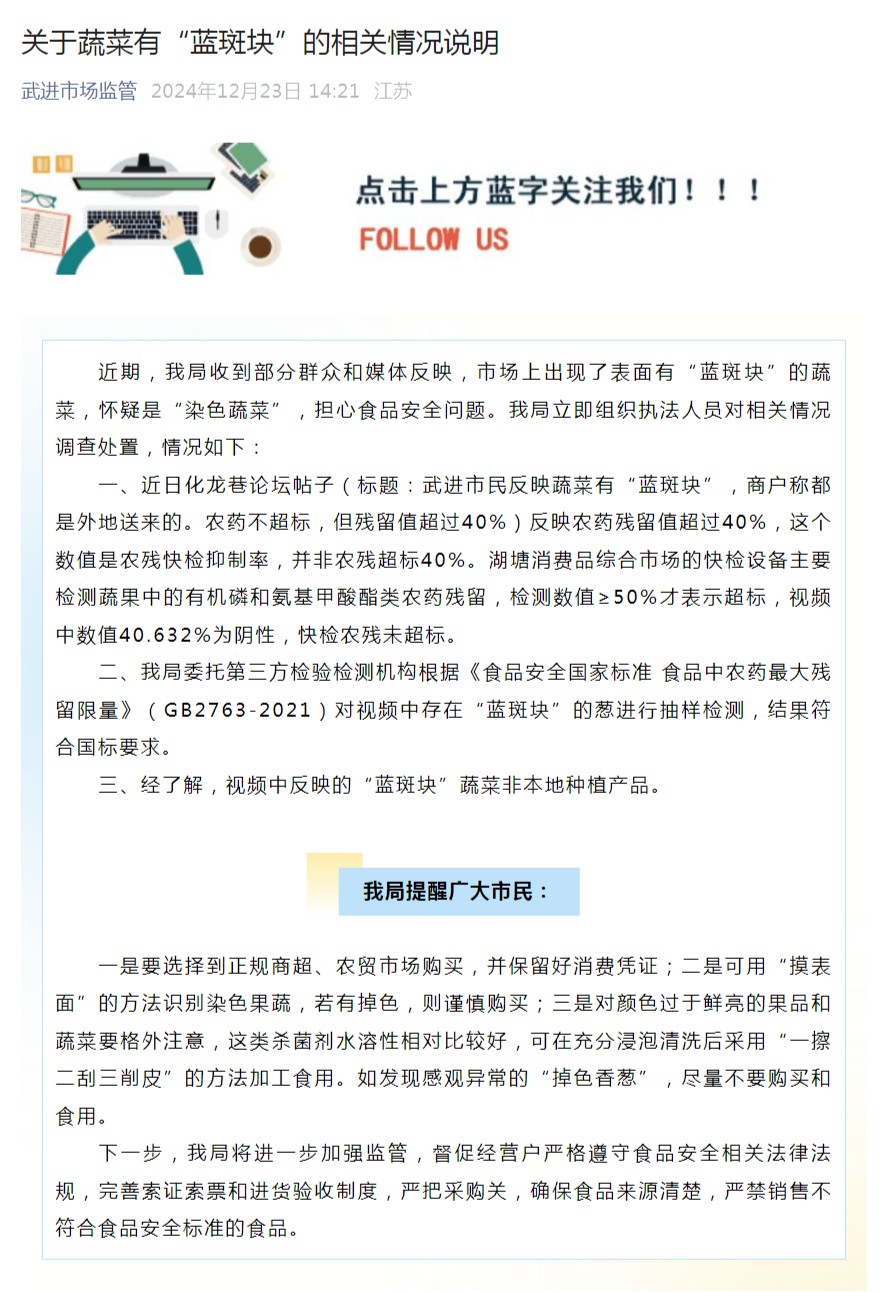 12月23日,江苏常州市武进区市场监管局发布关于蔬菜有“蓝斑块”的相关情况说明。