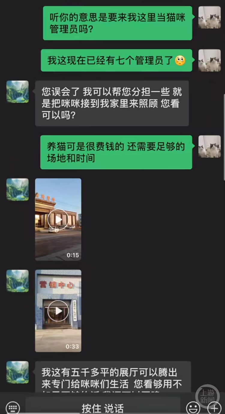 “11月底的时候,刘总从我一个北京的叔叔那里听说了我的事,就马上加了微信,提出想要帮忙收养一些猫咪。”小周表示,自己一开始也有些蒙,还误以为是刘先生想到自己这里当猫咪管理员,结果没想到对方是想把自己的猫分担一部分。