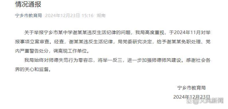 下午3时,宁乡市教育局发布《情况通报》显示,关于举报宁乡市某中学谢某某违反生活纪律的问题,我局高度重视,于2024年11月对举报事项立案审查。经查,谢某某违反生活纪律,局党委研究决定,给予谢某某免职处理、党内严重警告处分,调离现工作单位。