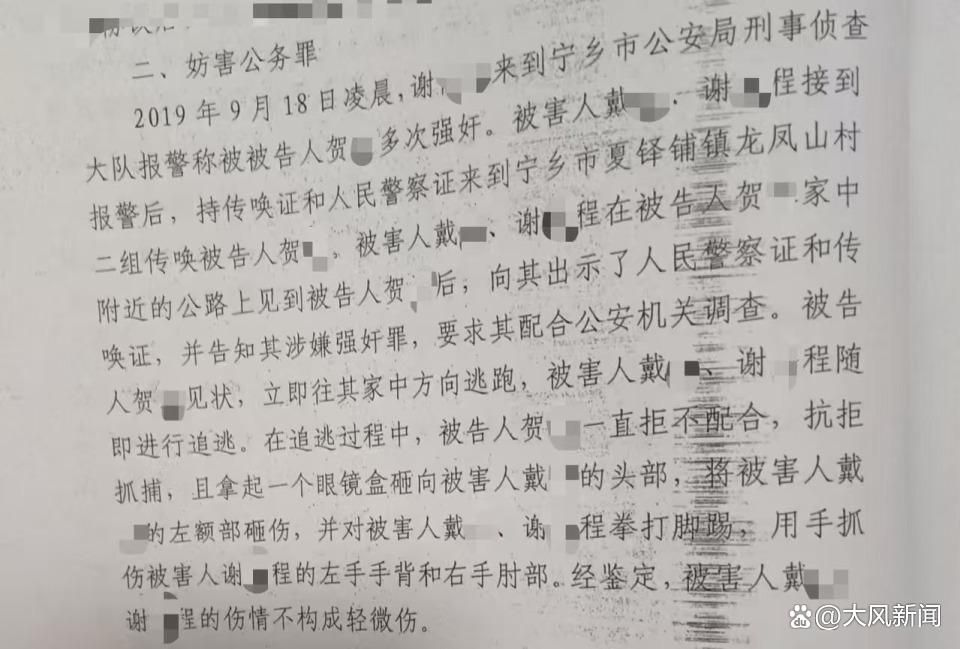 2020年12月29日,宁乡市法院一审《刑事判决书》显示,贺先生1989年生人。2019年9月18日,被宁乡市公安局刑事拘留,因涉嫌犯强奸罪、妨害公务罪,2019年10月24日,宁乡市检察院批准逮捕。