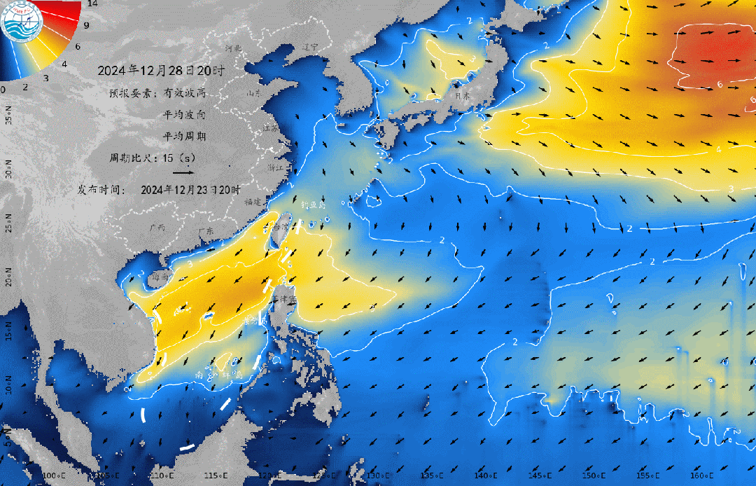 东海南部、钓鱼岛附近海域将生成新的大浪区,浪高2.2到2.8米;