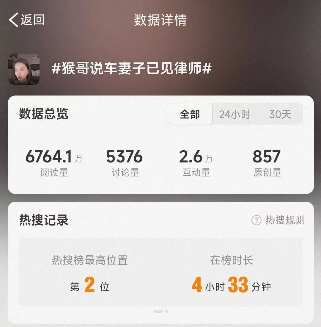 今年10月,“猴哥说车”在接受主持人张越采访时,透露了自己线下二期车库破产的状况。针对网友对夫妻没有合体出镜的质疑,“猴哥说车”回应称,大家都是独立的,想去把事做好就可以了。太把自己的生活公开在公众面前,不一定是很好的事,也会被反噬。