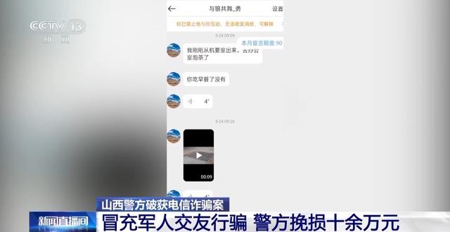今年5月份,大同市灵丘县的王女士通过网络交友平台结识了一名男子,该男子自称是一名现役军人。两人互加好友后,对方每天嘘寒问暖、关怀备至,还主动给王女士发来军官证,分享在部队的生活,两个人的关系迅速升温。