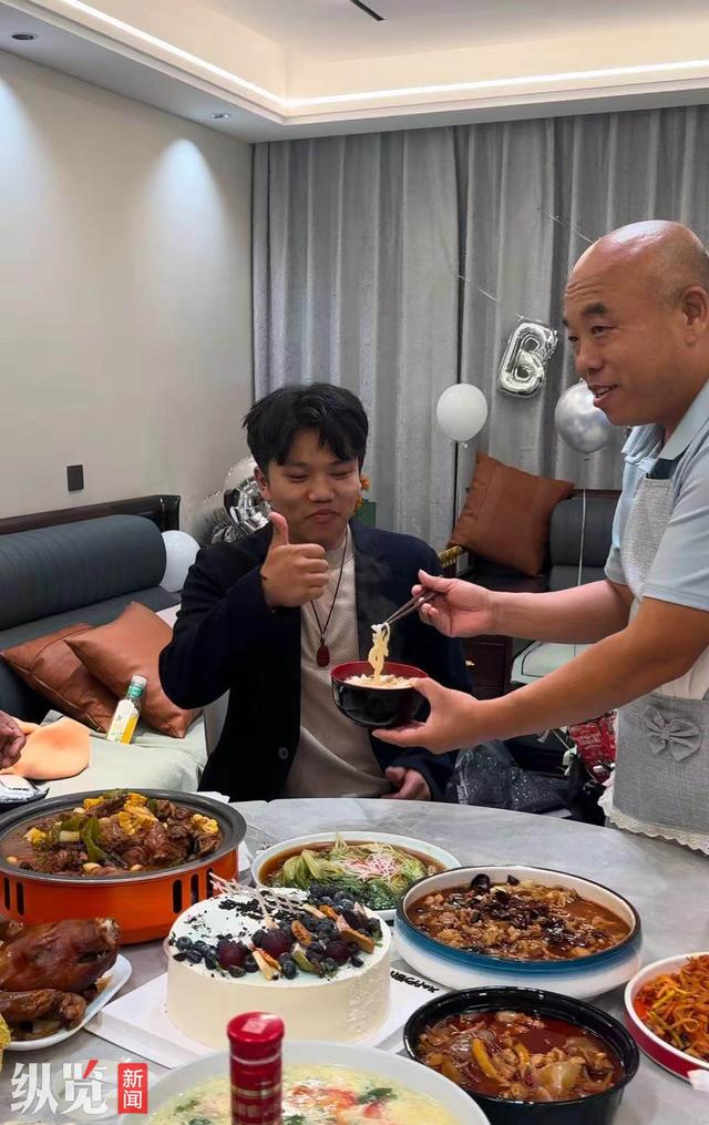 解清帅回家后的第一个生日,父亲喂他吃面。(来源/受访者提供)