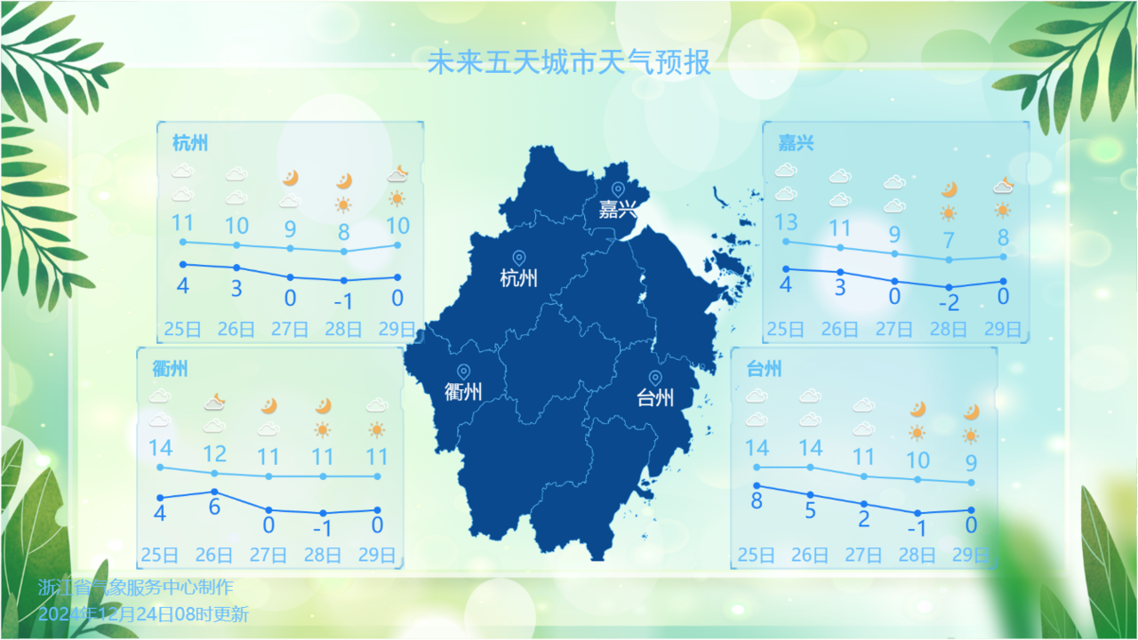 28-30日杭州早晨的气温较低,平原地区-1~2℃,有薄冰或霜冻,山区-2~-5℃,有冰冻。