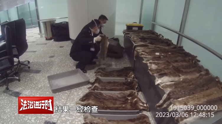 在例行检查中,海关人员发现,女子冯某随身携带的编织袋里,装满了疑似动物皮毛制品。