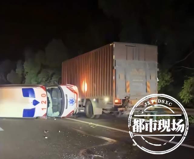 从网友路过拍下的视频可以看到,一辆120救护车直接侧翻倒在了一辆厢式大货车的左侧,且前挡风玻璃已经被撞碎了,玻璃散落一地。