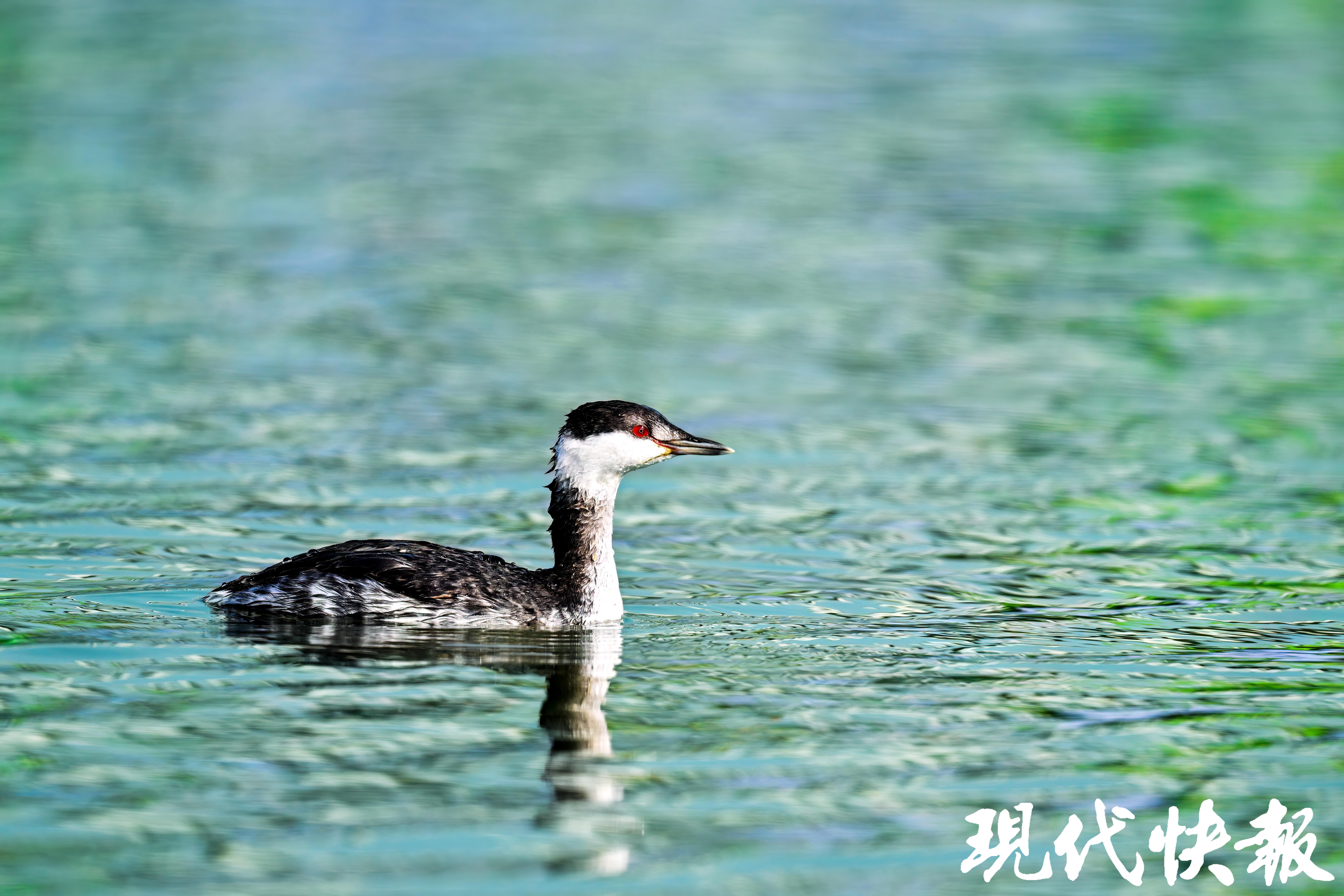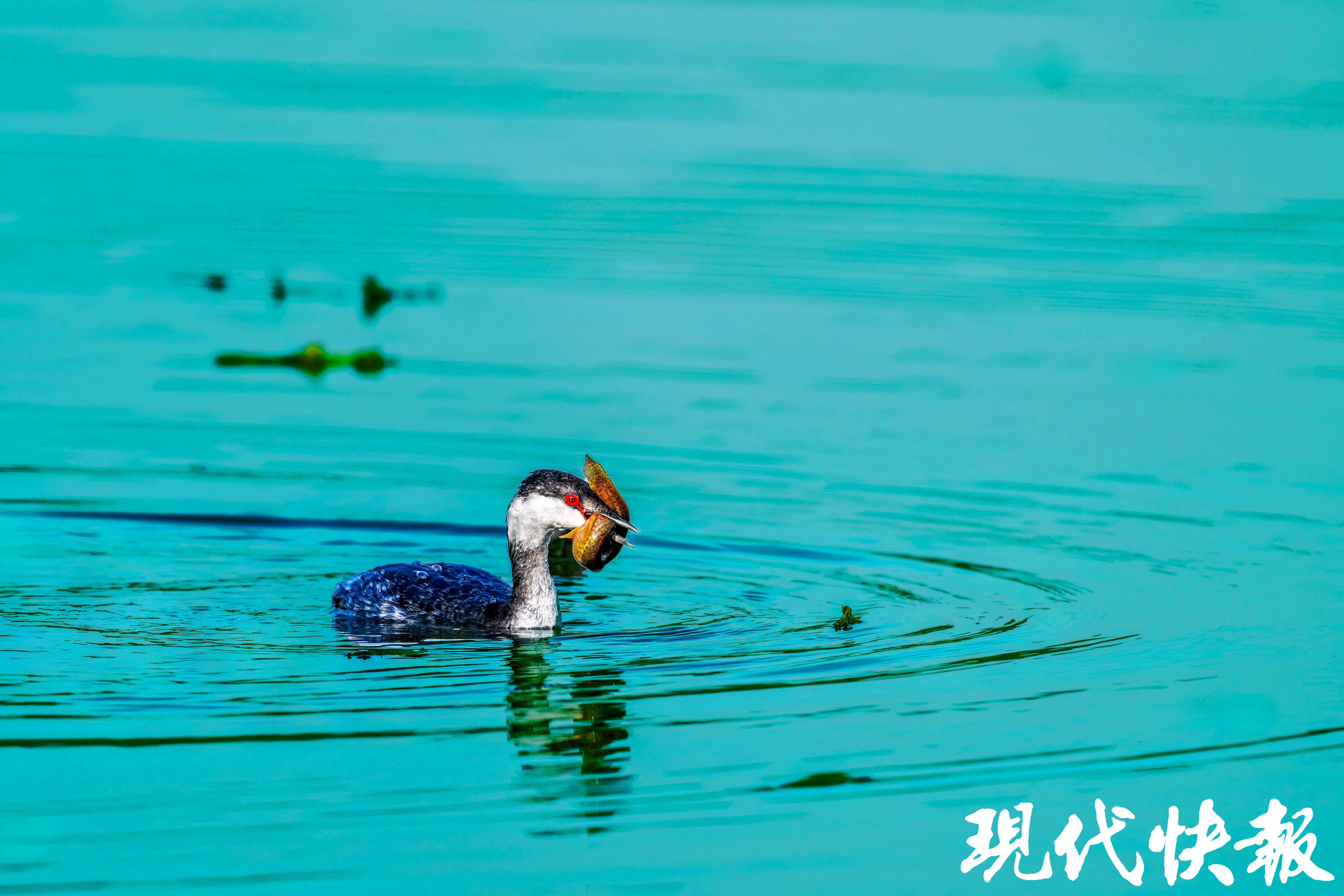 现代快报讯(通讯员杨福建记者郑阳)近日,拍鸟爱好者杨福建在徐州云龙湖发现了一只特别的“鸭子”,灰白相间的羽毛油光水滑,但嘴巴又尖又直,一双圆溜溜的眼睛像红宝石一样晶莹剔透。查阅资料后发现,这位“神秘访客”是国家二级保护野生动物角䴙(pì)䴘(tī)。