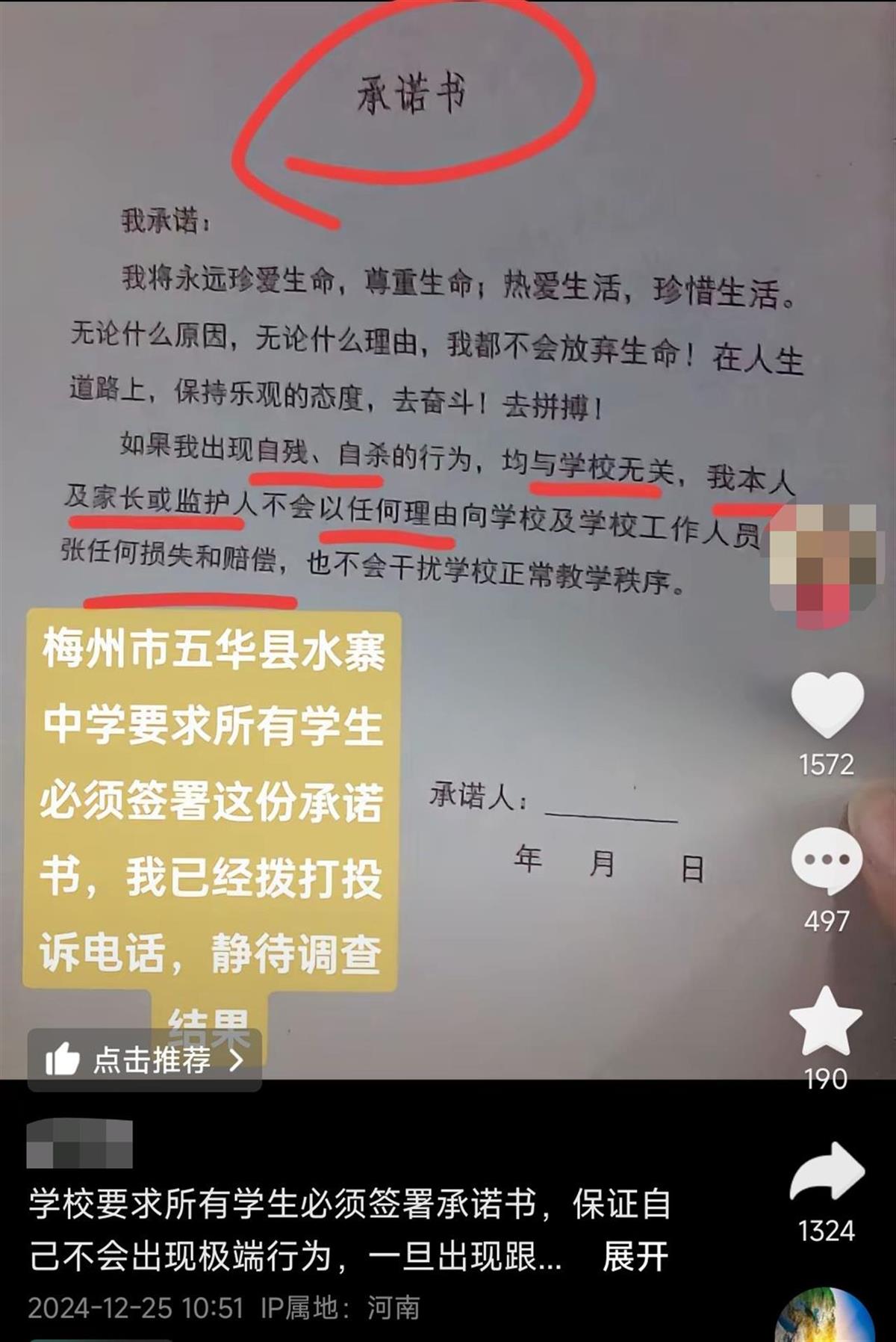 12月25日,有网友发视频称,广东梅州五华县水寨中学要求所有学生签署承诺书,承诺出现自杀、自残行为均与学校无关,不会以任何理由向学校主张赔偿。当日,五华县教育局工作人员表示,此事已在调查处理。
