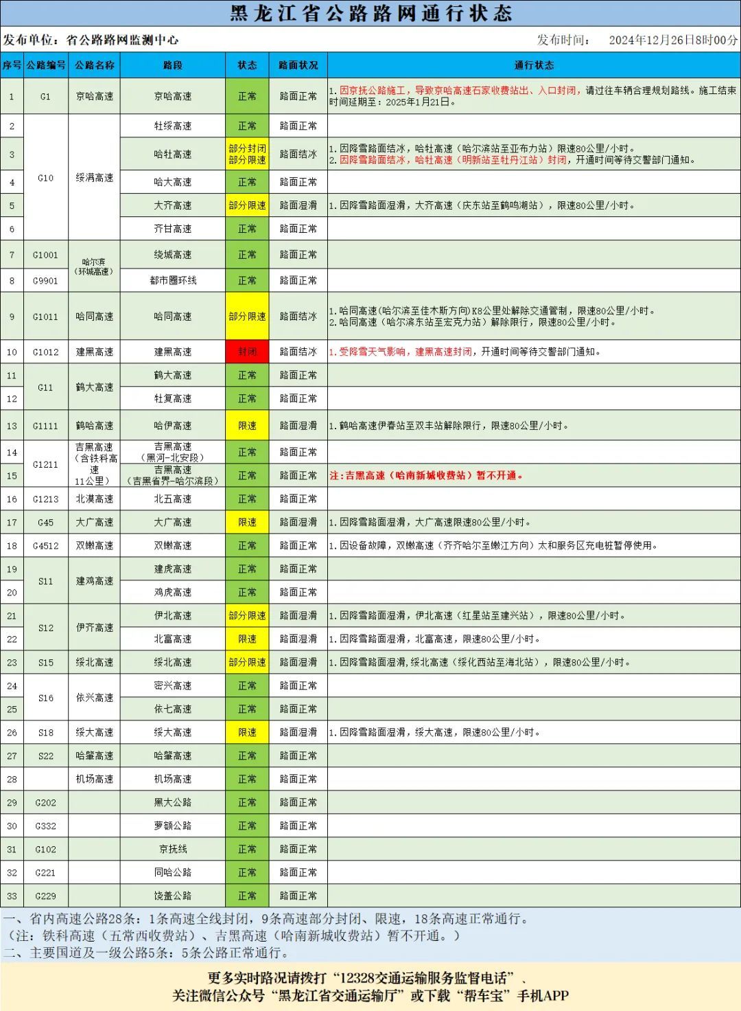 12月26日8时汇总路况信息:全线封闭的高速有(1条高速):建黑高速,封闭。部分封闭限速的高速有(9条高速):1.哈牡高速(明新站至牡丹江站),封闭。2.哈牡高速(哈尔滨站至亚布力站)、绥北高速(绥化西站至海北站)、北富高速、伊北高速(红星站至建兴站)、绥大高速、大广高速、大齐高速(庆东站至鹤鸣湖站)、哈同高速(哈尔滨东站至宏克力站)、鹤哈高速(伊春站至双丰站),限速80公里/小时。省内其它高速路况正常。
