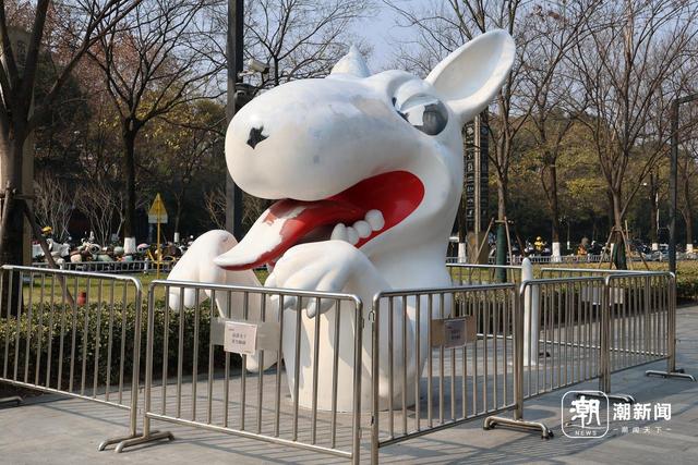 西入口的“狗”则是半身像,站立等待主人陪伴玩耍的造型。周围用围栏围着,贴着“油漆未干”。
