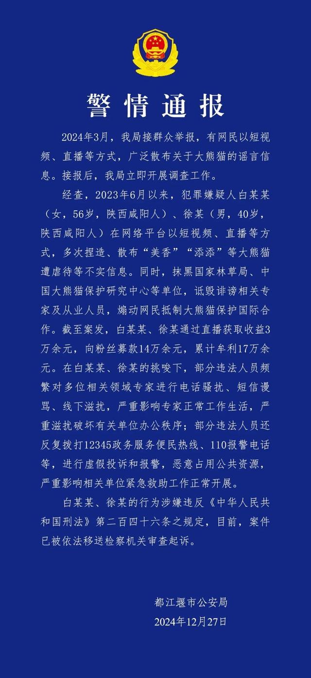 此外,为了获取粉丝信任,白某某还谎称其配偶徐某为退伍军人、特警,实际上,徐某无正当职业和固定收入。目前,两人均已被成都都江堰市公安机关依法采取刑事强制措施。办案民警告诉记者,该团伙所煽动的熊猫粉丝,大多为中老年妇女,这些人被误导后,来到中国大熊猫保护研究中心静坐示威、打横幅、尾随辱骂科研人员,部分已经被公安机关采取了相应处罚。