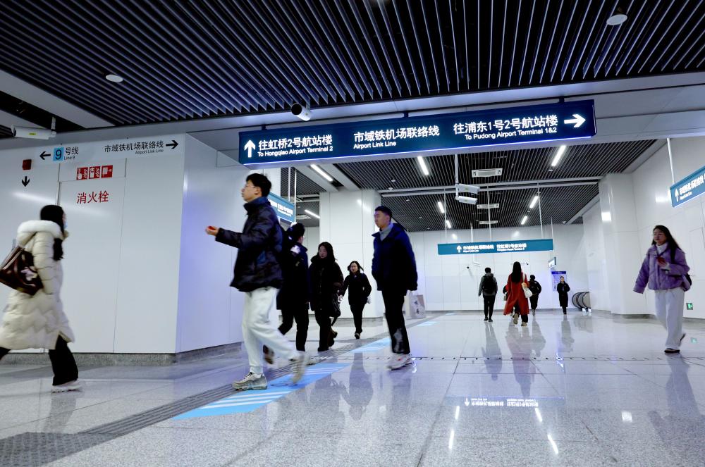 12月27日,乘客走在轨交地铁9号线与市域机场线换乘通道内。新华社记者 方喆 摄