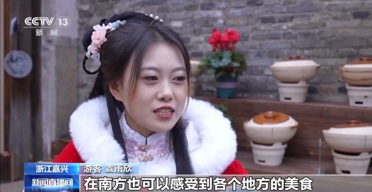 游客袁雨欣:我是从内蒙古过来的,在南方也可以感受到各个地方的美食,乌镇景区游玩很有冬天的氛围感。